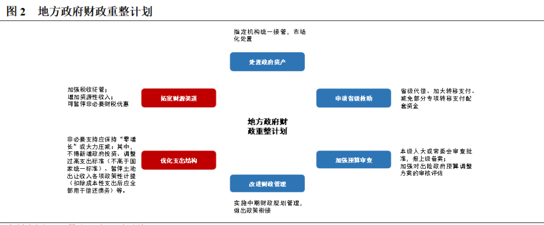 相比一般應急措施,財政重整計劃的處置思路與之一致,但對政府現(xiàn)金流的約束性和支持性更強,包括調整財政收支、投融資行為的審查、改進財政管理等方面。財政重整計劃期間,需保障必要的基本民生支出和政府有效運轉支出,不得因為償還債務本息影響政府基本公共服務的提供。從重整計劃設計看,最主要的方式是“開源節(jié)流”,尤其對支出領域進行嚴格限制,包括不得新批政府投資計劃,不得新上政府投資項目,不得設立各類需要政府出資的投資基金等,壓縮政府公用經(jīng)費和控制人員福利開支,調整過高支出標準,暫停土地出讓收入各項政策性計提等。當?shù)胤秸詡鶆诊L險得到緩解、控制,地方政府實現(xiàn)財政重整目標,經(jīng)上級政府債務管理領導小組或債務應急領導小組同意,終止應急措施。