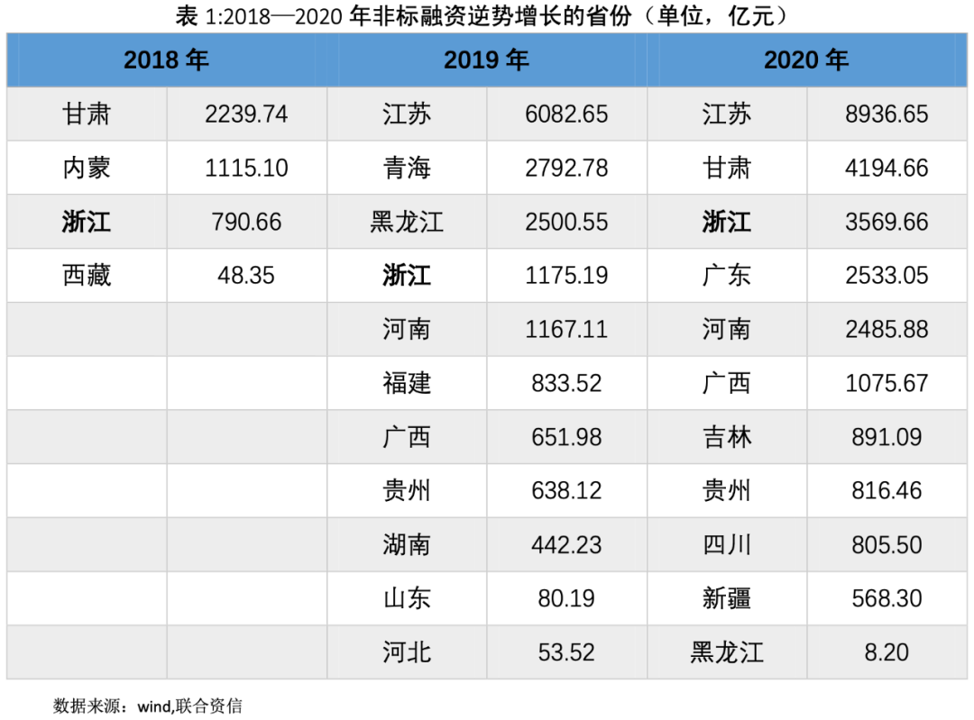 分年度觀察,2018年只有甘肅等四省份逆勢擴張,2019年逆勢擴張的是江蘇等11個省份,2020年逆勢擴張的省區(qū)仍然為11個,主要是江蘇、甘肅等省份。進一步可以看到,浙江是唯一一個非標融資增量在2018—2020年連續(xù)3年正增長的省份,其次江蘇、甘肅、河南、黑龍江、廣西五省區(qū)三年中有二年實現(xiàn)正增長,此外還有青海、吉林、湖南、四川、河北、廣東、內(nèi)蒙等11個省區(qū)三年中有一年實現(xiàn)正增長,其余各省區(qū)都是連續(xù)三年負增長。
