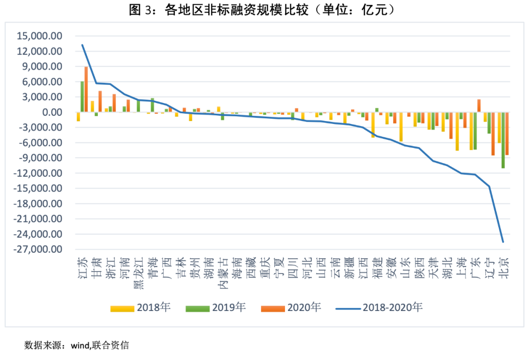 央行統(tǒng)計數(shù)據(jù)顯示,大多數(shù)省份2018年—2020年3年間非標融資凈增量為負值,或者說非標融資規(guī)模是在壓降政策作用下順勢收縮的,但有些地區(qū)仍在逆勢擴張。其中順勢收縮的地區(qū)有北京(-2.55萬億元)、天津(-0.96萬億元)、遼寧(-1.46萬億)、上海(-1.20萬億)、廣東(-1.23萬億)、湖北(-1.20)和山東(-0.67萬億)等22個省區(qū),同時江蘇(+1.32萬億)、甘肅(+0.57萬億)、浙江(+0.55萬億)、河南(+0.35萬億)、黑龍江(+0.24萬億)和青海(+0.22萬億)7個省區(qū)非標融資規(guī)模繼續(xù)逆勢擴張。誠然順勢收縮的地區(qū)數(shù)量占大多數(shù),但逆勢擴張地區(qū)的占比也不小,非標融資的地區(qū)分化特征比較明顯。