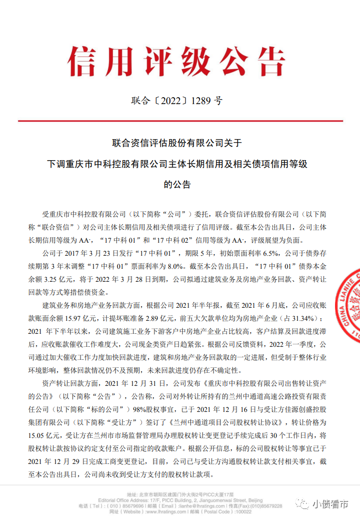 3月1日,聯(lián)合資信公告稱,將重慶市中科控股有限公司(以下簡稱“中科控股”)主體長期信用等級由“AA-”下調為“A”,將“17中科01”和“17中科02”信用等級由“AA-”下調為“A”,評級展望為“負面”。