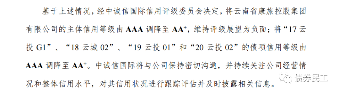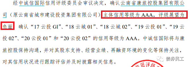 根據(jù)中誠(chéng)信國(guó)際2022年2月7日披露的公告(蓋章日為2022年1月27日),云南省康旅控股集團(tuán)有限公司(原名為云南省城市建設(shè)投資集團(tuán)有限公司,以下簡(jiǎn)稱(chēng)“云南康旅集團(tuán)”)的主體信用等級(jí)由AAA調(diào)降至AA+,評(píng)級(jí)展望保持為負(fù)面。這是2022年以來(lái)首個(gè)AAA發(fā)行人主體評(píng)級(jí)被下調(diào)!