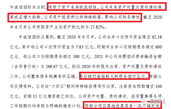 評(píng)級(jí)展望確認(rèn)為負(fù)面的主要原因是公司未來(lái)資產(chǎn)處置及債權(quán)清收難度增大、資產(chǎn)抵質(zhì)押比例較高、債務(wù)償付壓力較大、項(xiàng)目落地具備一定的不確定性等。