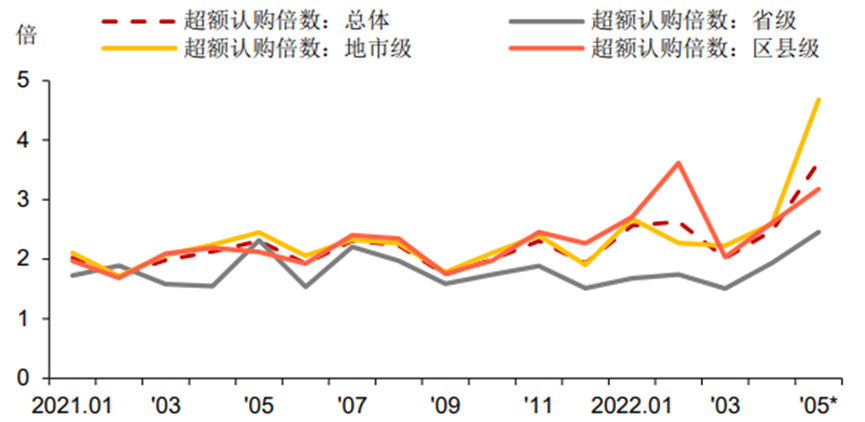 無獨有偶,5月27日,貴州三期地方債中標利率均較下限上浮15bp,投標倍數(shù)介于34-42之間。數(shù)據(jù)顯示,22貴州債25/26/27(對應期限30/5/7)的全場認購倍數(shù)為41.23/34.25/35.82。