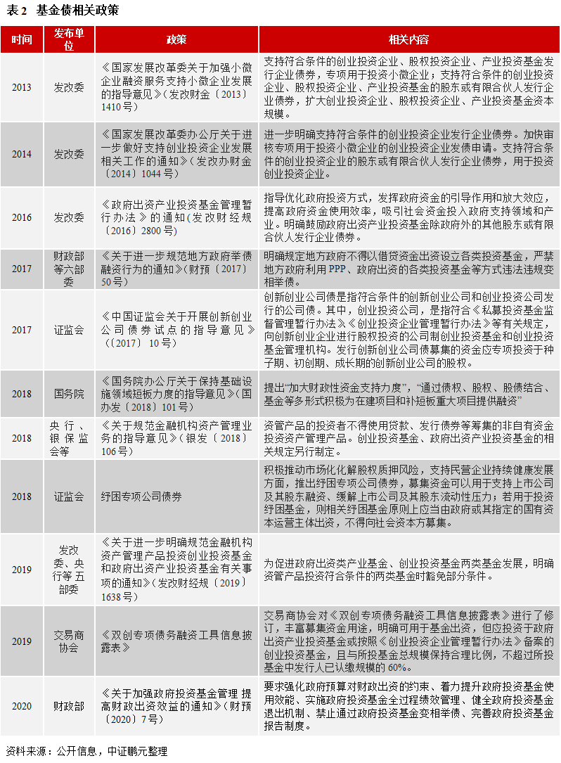 2016年發改委發布《政府出資產業投資基金管理暫行辦法》(發改財經規〔2016〕2800號),明確鼓勵政府出資產業投資基金除政府外的其他股東或有限合伙人發行企業債券,規范了政府引導基金的債券融資行為。2017年財政部等六部委聯合發布《關于進一步規范地方政府舉債融資行為的通知》(財預〔2017〕50號),明確規定地方政府不得以借貸資金出資設立各類投資基金。50號文的出臺,進一步為推動企業發行基金債埋下了伏筆。