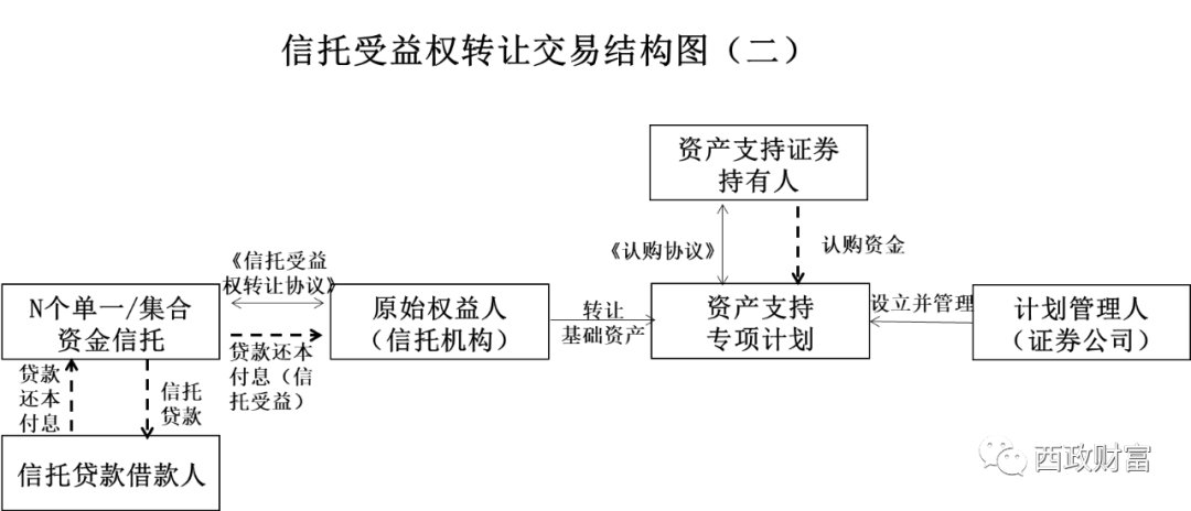 3.信托機(jī)構(gòu)與專項(xiàng)資管計(jì)劃管理人簽署《信托受益權(quán)轉(zhuǎn)讓協(xié)議》,將信托受益權(quán)作為基礎(chǔ)資產(chǎn)轉(zhuǎn)讓給專項(xiàng)計(jì)劃并設(shè)立ABS;
