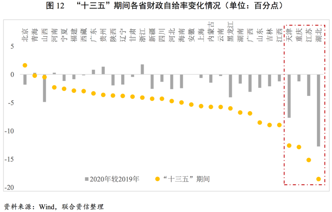 2020年,亦是“十三五”收官之年,各省一般公共預算收入年均復合增速的中位數為2.61%,增長幅度較小,各省財政自給率中位數亦較2016年下降10.47個百分點至38.26%。除傳統認為財政實力較弱且財政自給率較低的西北、東北及西南云貴等區域外,“十三五”期間,天津及重慶財政收入增速低于全國水平且自給率降幅較大,財政收支矛盾較“十三五”期初更為突出。