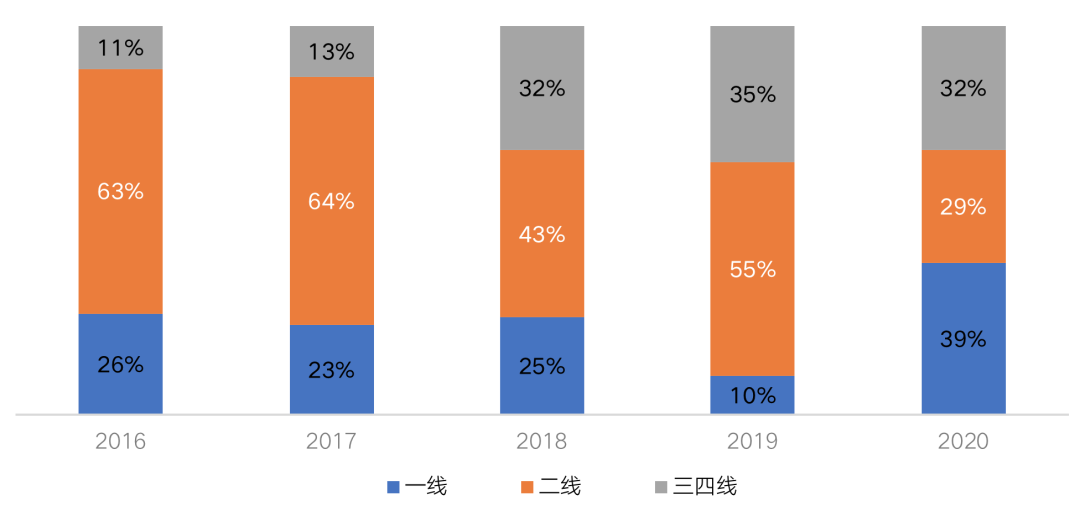 總體來看,2020年金地集團新增土儲建面在一二線城市的占比合計約63% ,依舊為企業主力布局區域。2020年金地加大了一線城市的投資力度,這部分投資額占比較2019年提升29個百分點,達到39%,單是6月華東區域在上海就拿下三幅住宅用塊,拿地金額達94億元,計容建面約34萬方。