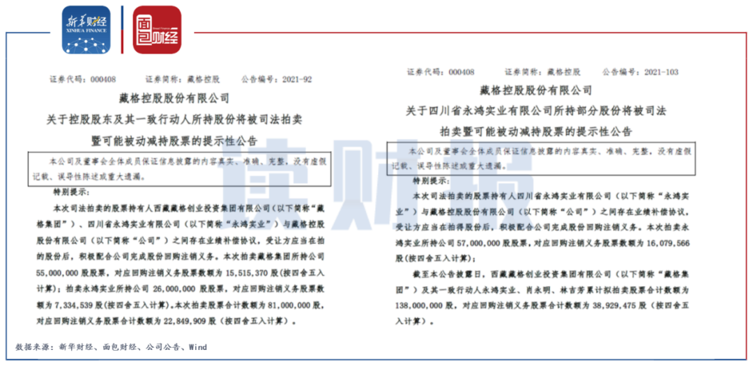 2021年9月23日,藏格控股發(fā)布公告稱,公司于近日收到控股股東藏格集團及其一致行動人永鴻實業(yè)的《告知函》,將于2021年10月21日10時至2021年10月22日10時在淘寶網(wǎng)司法拍賣網(wǎng)絡平臺上公開拍賣藏格集團持有的5500萬股及永鴻實業(yè)持的2600萬股公司首發(fā)后限售股。