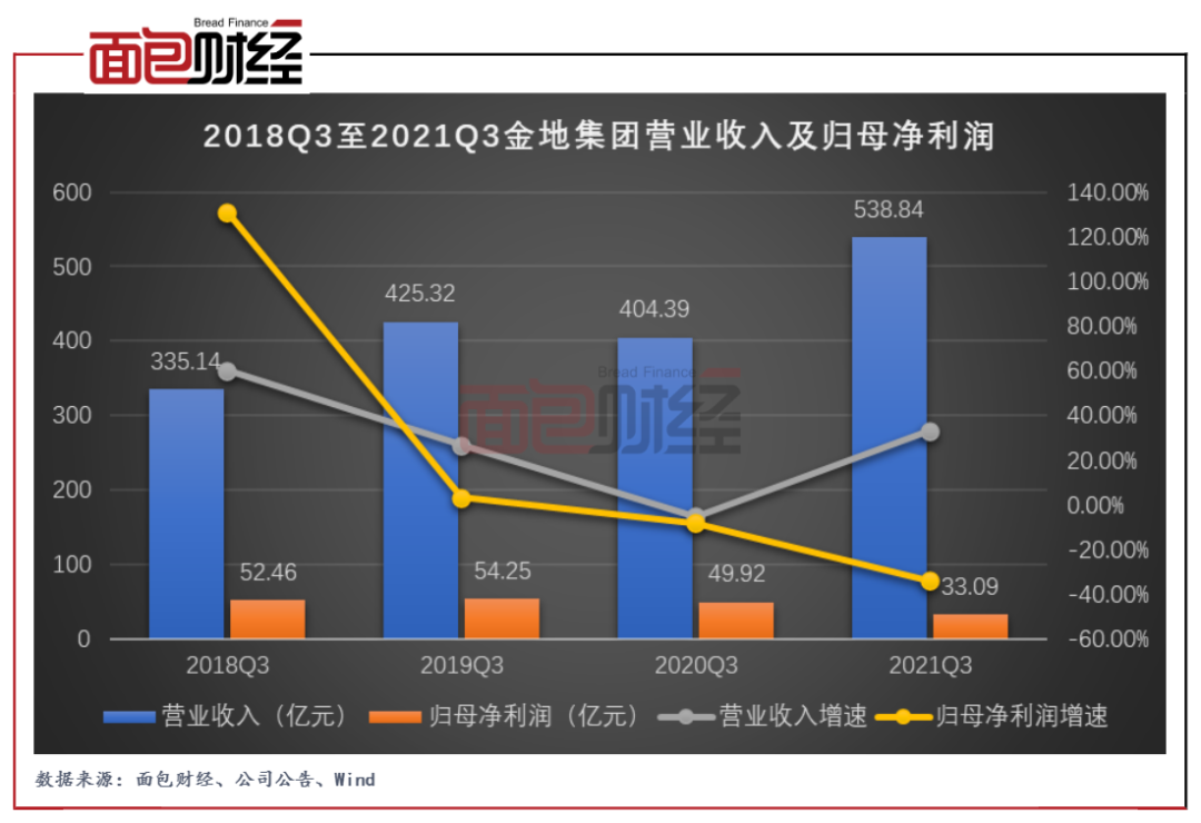 圖2:2018Q3至2021Q3金地集團營業收入及歸母凈利潤