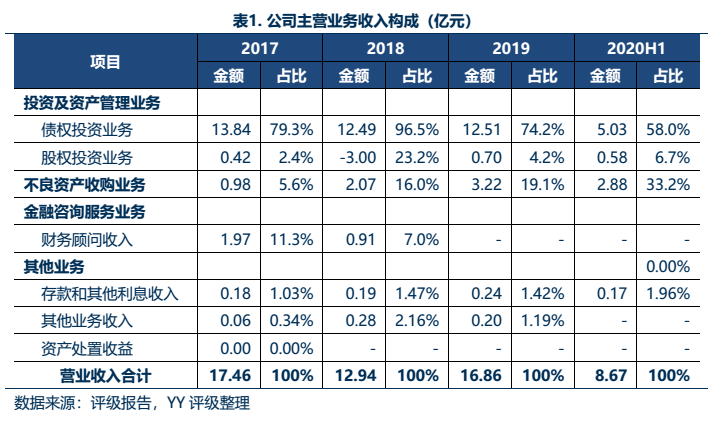公司收入來源包括利息收入、手續費及傭金收入、投資收益以及公允價值變動損益,利息收入(包括信托貸款、委托貸款和收購非金融機構的不良資產包產生的利息收入)為公司最主要收入來源(2018年新會計準則下,債權投資產生的收益計入利息收入)。2019年利息收入14.58億元,其中債權投資產生的利息收入14.34億元,其余為銀行存款利息。從業務細分看,新會計準則下投資收益主要來自收購和處置金融機構的不良資產以及長期股權投資產生的投資收益,前者占比約90%。公允價值變動損益在不同年份之間的波動較大,2018年受二級股票市場影響,股價下降幅度較大,對營業凈收入形成拖累。