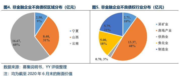 不良資產底層債務人來看,存量非金融項目主要涉及采礦業、制造業和房地產業,其中8個項目的底層債務人為民企;約48%投向了房地產業;區域分布于山西、云南和寧夏地區,云南地區占比60%。