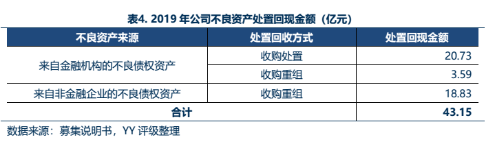 不良資產來源方面,公司金融類和非金融類不良資產占比較為均衡。截至2018和2019年末,公司來自金融機構/非金融企業的不良債權資產占比分別為55.48%/44.52%、53.42%/46.57%。