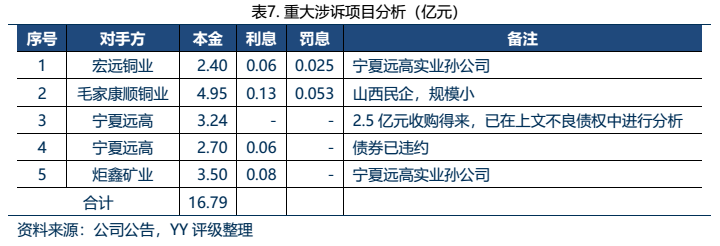 具體來看,項目1、3、4、5均與寧夏遠高實業有關。2020年11月23日,寧夏遠高的“18遠高01”發生實質性違約,此前寧夏遠高已申請破產重整。在這一背景下,公司贏得訴訟之后,也將面臨著回款周期長、與多個金融機構共同追債等困難情況,執行難度大。考慮到均有抵質押物等增信,保守估計清償率按30%的情況下,這5個重大涉訴項目將導致約11億元的損失。