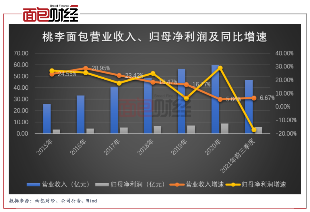 圖2:2015年至2021年前三季度桃李面包營業收入、歸母凈利潤及同比增速