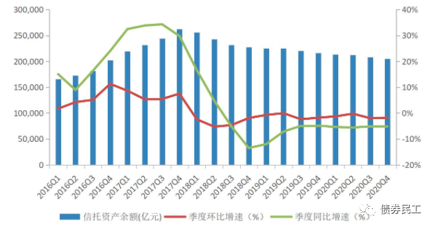 從信托資產規模數據來看,截至2020年底,信托資產規模為20.49萬億元,同比2019年下降5.17%,較2017年底信托資產最高峰的26.25萬億元下降了5.76萬億,下降了21.94%?。〝祿碜杂谥袊磐袠I協會公布的數據)