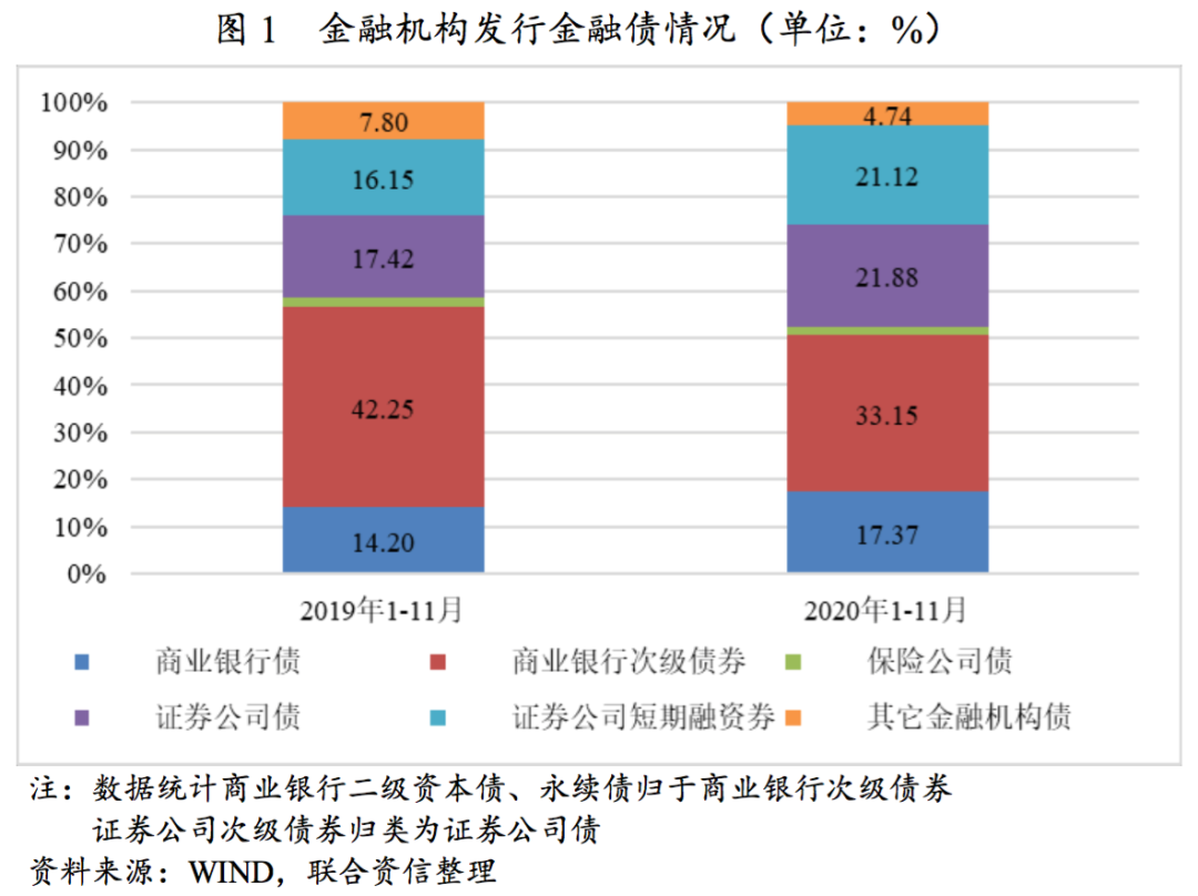 截至2020年11月末,整個(gè)債券市場(chǎng)發(fā)行規(guī)模共計(jì)發(fā)行39.55萬(wàn)億元,共發(fā)行只數(shù)4.37萬(wàn)只,其中金融債占債券市場(chǎng)份額達(dá)16.53%。從金融債券行業(yè)類型來(lái)看,2020年1-11月,商業(yè)銀行金融債發(fā)行量(含次級(jí)債和普通債券)占比達(dá)50.52%,同比小幅下降5.93個(gè)百分點(diǎn),證券公司發(fā)行量(公司債、短期融資券)占比達(dá)43.00%,同比增長(zhǎng)9.43個(gè)百分點(diǎn),其他金融機(jī)構(gòu)及保險(xiǎn)公司發(fā)債規(guī)模低于10%。