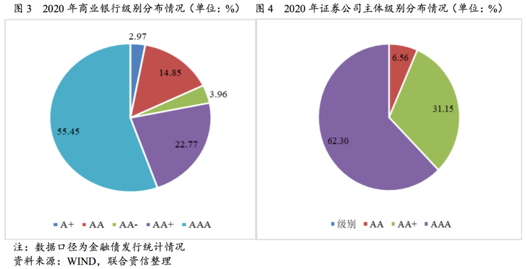 商業(yè)銀行信用級(jí)別分布較廣,證券公司高信用級(jí)別發(fā)債占比高于商業(yè)銀行。