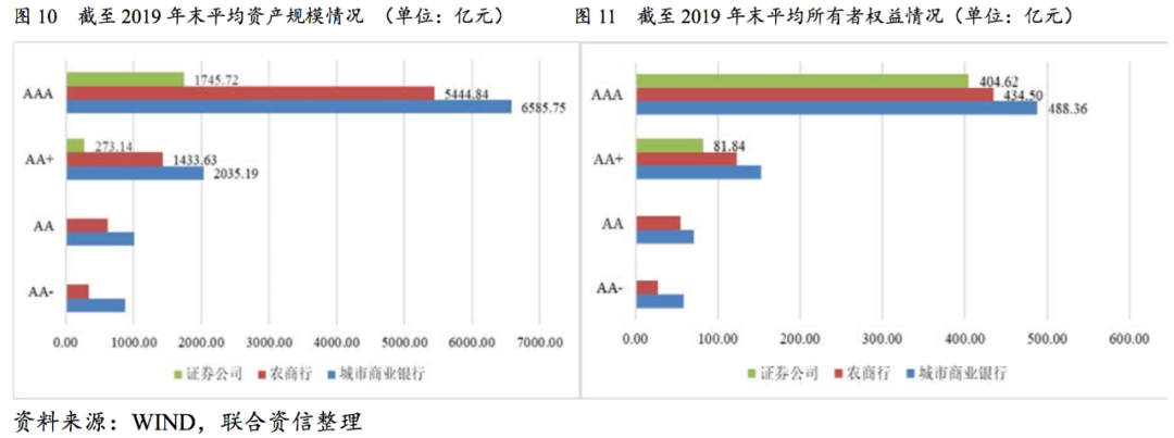 國(guó)有商業(yè)銀行和股份制商業(yè)銀行資產(chǎn)規(guī)模、凈利潤(rùn)等規(guī)模性指標(biāo)明顯優(yōu)于證券公司,且其所在金融系統(tǒng)中具有重要地位。本文選擇債券市場(chǎng)上有存續(xù)主體級(jí)別的城商行、農(nóng)商行以及同信用級(jí)別的證券公司進(jìn)行對(duì)比。從資產(chǎn)規(guī)模來(lái)看,截至2019年末,主體信用級(jí)別為AAA級(jí)別城商行平均規(guī)模達(dá)6585.75億元,農(nóng)商行次之,整體平均資產(chǎn)規(guī)模為證券公司3.7倍左右,主體信用級(jí)別AA+的證券公司與城商行、農(nóng)商行差距達(dá)7~10倍左右;主體信用級(jí)別為AAA的城商行平均所有者權(quán)益規(guī)模達(dá)488.36億元,證券公司與其規(guī)模差距明顯低于資產(chǎn)規(guī)模對(duì)比情況。