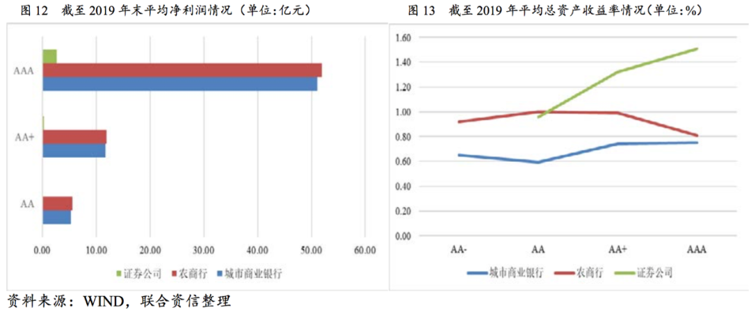 ?國(guó)有商業(yè)銀行和股份制商業(yè)銀行規(guī)模效應(yīng)顯著。同主體信用級(jí)別下,城商行、農(nóng)商行資產(chǎn)規(guī)模和凈利潤(rùn)規(guī)模明顯優(yōu)于證券公司;所有者權(quán)益方面,AAA主體信用級(jí)別證券公司與城商行、農(nóng)商行差距較小,且AA+~AAA級(jí)證券公司ROA水平高于城商行、農(nóng)商行。
