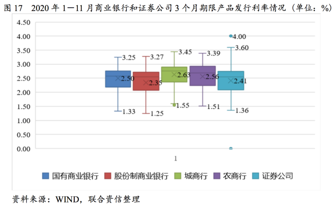 短期限產(chǎn)品中,股份制商業(yè)銀行利率均值最優(yōu),3個(gè)月期限產(chǎn)品證券公司發(fā)行利率均值優(yōu)于國(guó)有銀行、城商行和農(nóng)商行。6個(gè)月、9個(gè)月期限產(chǎn)品,證券公司與農(nóng)商行和城商行發(fā)行利率均值差距較小。