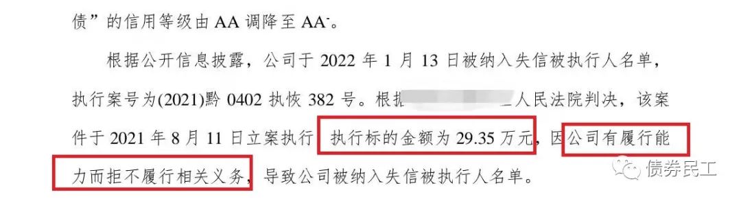根據(jù)評級公司于2022年1月20日披露的公告,某城投公司因為執(zhí)行標(biāo)的金額為29.35萬元的案件有履行能力而拒不履行相關(guān)義務(wù),于2022年1月13日被納入失信被執(zhí)行人名單。