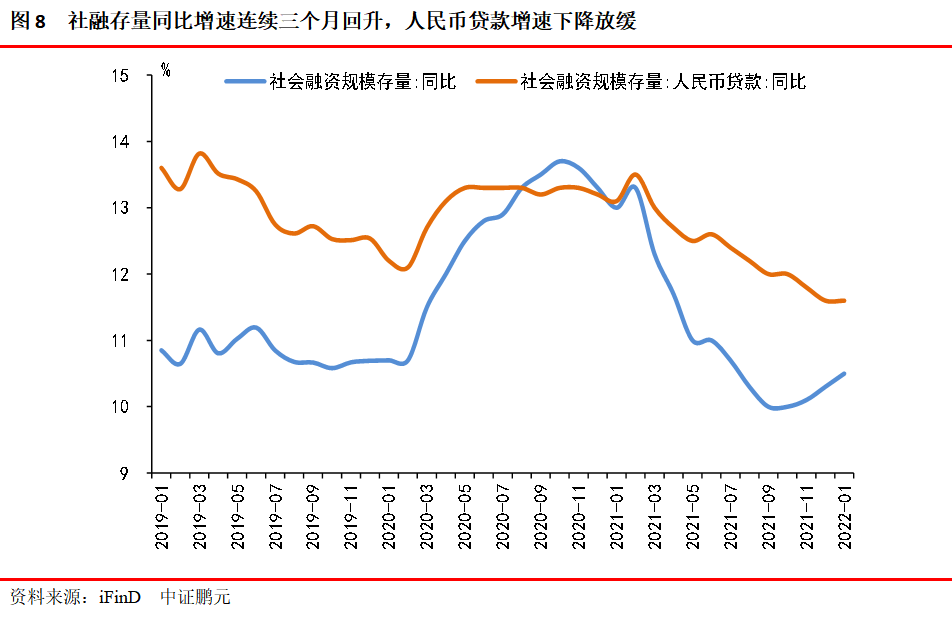 社融和信貸超預(yù)期,實現(xiàn)開門紅,寬信用初步形成。1月社融增量為61,700億元,比2021、2020年同期多增9,816億元、1.12萬億元。社融存量增速10.5%,前值10.3%,已連續(xù)三個月回升。新增信貸3.98萬億,同比多增4,000億元,單月新增規(guī)模創(chuàng)歷史新高,企業(yè)短期貸款多增較多,信貸結(jié)構(gòu)出現(xiàn)分化。