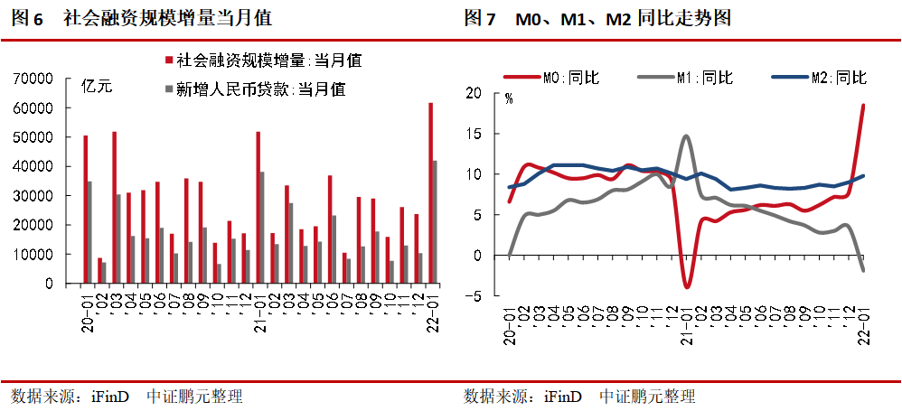 2022年1月社會融資規(guī)模增量為61,700億元,前值為23,682億元,比2021年同期多增9,816億元,比2020年同期多增1.12萬億元。社融存量增速10.5%,前值10.3%,已連續(xù)三個月回升。M2同比9.8%,前值9.0%;M1同比-1.9%,前值3.5%。先看社融的結(jié)構(gòu):