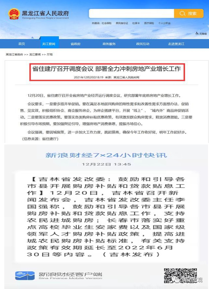 例如,2021年12月20日,黑龍江省政府發布《省住建廳召開調度會議部署全力沖刺房地產業增長工作》(21日這一新聞便官網被撤下),稱黑龍江省住建廳召開全省房地產業經濟運行調度會議,要求要想辦法促銷售,落實購房補貼政策,提振市場信心。