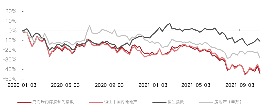 自2020年1月1日至今,克而瑞內房股領先指數跌幅44.0%,同期恒生中國內地地產指數跌幅41.0%。恒生指數跌幅10.8%,房地產(申萬)板塊跌幅28.2%。2021年10月,恒生指數上漲3.3%,克而瑞內房股領先指數下降8.5%,恒生中國內地地產指數下降4.7%,房地產(申萬)板塊下降8.9%。