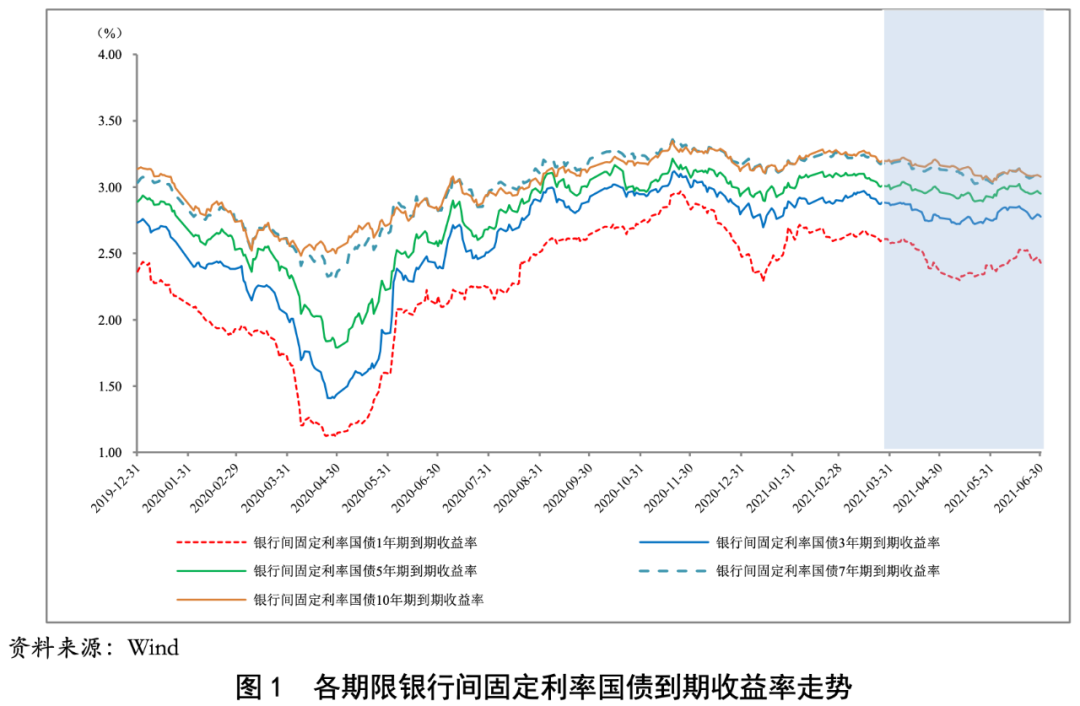 具體來看,本季度銀行間固定利率國債一年期到期收益率平均水平(2.44 %)較上季度(2.58%)下降14BP,較上年同期(1.54%)上升89BP;銀行間固定利率國債三年期、五年期、七年期以及十年期到期收益率平均水平分別為2.79%、2.96%、3.11%和3.13%,較上季度(2.87%、3.03%、3.19%和3.21%)分別下降8BP、7BP、9BP和7BP,較上年同期(1.88%、2.20%、2.62%和2.68%)分別上升91BP、76BP、49BP和45BP。