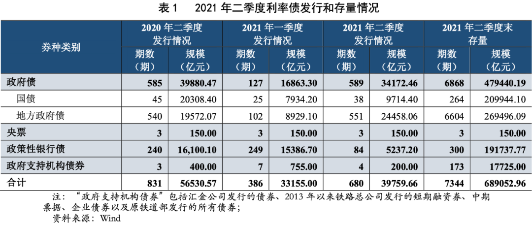 本季度,債券市場共發行利率債3.98萬億元,環比增長19.92%,同比減少29.67%。其中,地方政府債的二季度發行量增幅顯著,可能由于一季度地方債提前批額度下達較晚,二季度地方債額度下達后集中發行,導致發行量環比大幅增長。政策性銀行債的二季度發行量降幅顯著。截至2021年二季度末,我國債券市場利率債品種存量規模達到68.91萬億元,較上季度末繼續增加。
