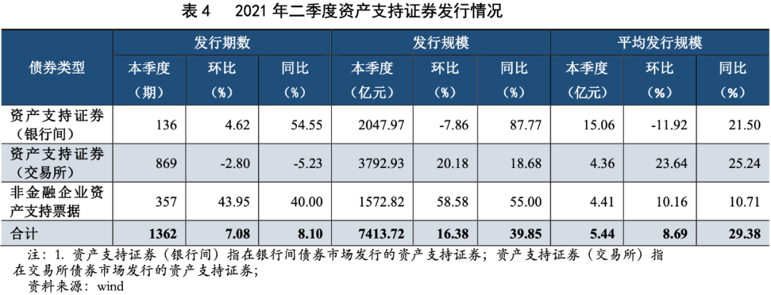 本季度,銀行間和交易所資產支持證券以及非金融企業資產支持票據的發行量合計環比和同比均有所增長,平均發行規模環比和同比亦有不同程度的增長。主要由于新冠疫情得到控制后,實體經濟具有更強的融資需求、鼓勵消費政策的不斷推出促進消費貸款資產支持證券二季度發行量繼續保持較大增幅,此外本季度票據收益類資產支持證券繼續保持大幅增長。