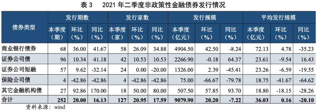 本季度,共有127家金融機構發行非政策性金融債252期[2],總發行規模為9079.90億元,非政策性金融債發行期數、發行家數和發行規模環比均有20%左右的增幅;發行期數和發行家數同比有所增長,但發行規模同比整體有所下降。其中,證券公司債發行量同比增幅較大,證券公司短期融資券發行量同比大幅下降,可能由于今年3月5日央行發布《證券公司短期融資券管理辦法》(修訂征求意見稿),其中“近1年內流動性覆蓋率持續高于行業平均水平”的條例對證券公司短融的發行造成了影響。商業銀行債(含商業銀行金融債、商業銀行其他一級資本工具[3]、商業銀行二級資本工具)發行量環比有所增長,主要受商業銀行二季度融資需求較旺盛因素影響。保險公司債券發行量環比和同比大幅下降,而其他金融機構債發行量環比和同比增幅較顯著。