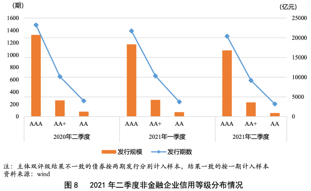 整體來看,二季度非金融企業債券或主體的信用級別仍集中在AA+及以上級別,AAA級占比環比有所增長,信用等級集中度有所提高。