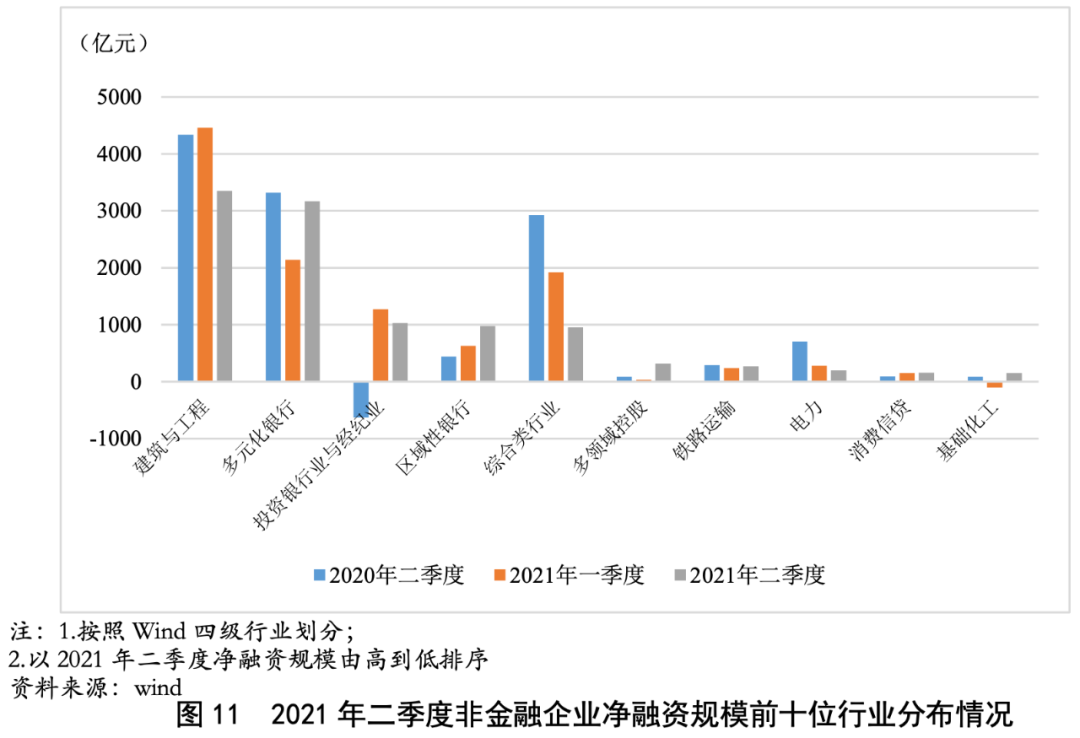 從凈融資情況來看,本季度,建筑與工程、多元化銀行和投資銀行業與經紀業凈融資規模位列前三位。建筑與工程行業凈融資規模為3351.42億元,位列第一,但受本年城投融資嚴監管的影響,凈融資額環比和同比均有20%左右的降幅,而多領域控股行業凈融資規模環比和同比均大幅上升。此外,基礎化工、房地產開發、汽車制造和建材等行業凈融資規模由負轉正,而鋼鐵、煤炭與消費用燃料行業凈融資規模持續為負。