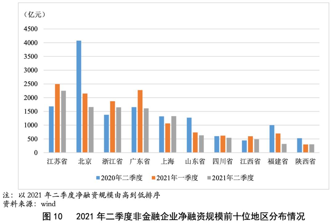 從凈融資情況來看,本季度,江蘇、北京和浙江地區凈融資規模位列前三位。在凈融資規模排名前十的地區中,江蘇、北京、廣東、山東、四川和福建地區凈融資規模環比和同比均有不同程度下降,其中福建地區降幅較大,達50%以上;此外,本季度河南省凈融資規模由負轉正,天津、云南、河北、遼寧和山西凈融資規模持續為負,但均有不同程度增長。