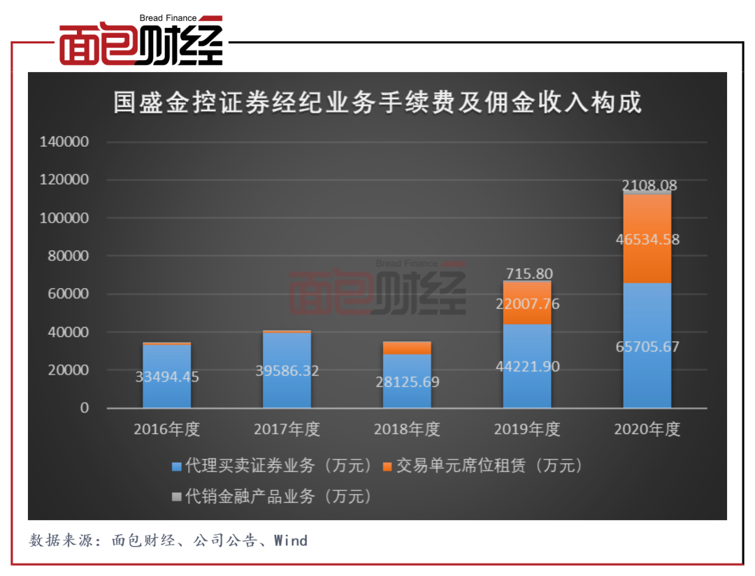 2020年,國盛金控代銷的基金總金額42.31億元,同比增幅達230.77%。相應地,公司代銷的資管計劃、債券產品總金額37.46億元,同比減少71.88%。期間,代銷基金規模的增長與良好的市場行情和隨之高漲的居民理財需求相關。