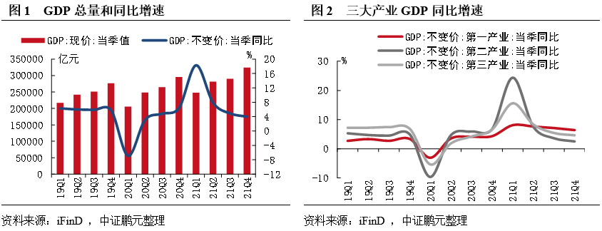 2021年,我國國內(nèi)生產(chǎn)總值GDP為1,143,670億元,按不變價(jià)格計(jì)算,同比增長8.1%,兩年平均增長5.1%,經(jīng)濟(jì)總量穩(wěn)居世界第二,占全球經(jīng)濟(jì)的比重預(yù)計(jì)超過18%,經(jīng)濟(jì)增速在全球主要經(jīng)濟(jì)體中名列前茅。分產(chǎn)業(yè)來看,第一產(chǎn)業(yè)增加值83,086億元,增長7.1%,拉動(dòng)經(jīng)濟(jì)增長0.5個(gè)百分點(diǎn);第二產(chǎn)業(yè)增加值450,904億元,增長8.2%,拉動(dòng)經(jīng)濟(jì)增長3.1個(gè)百分點(diǎn);第三產(chǎn)業(yè)增加值609,680億元,增長8.2%,拉動(dòng)經(jīng)濟(jì)增長4.5個(gè)百分點(diǎn)。三大產(chǎn)業(yè)增加值占GDP的比重分別為7.3%、39.4%和53.3%。與上年相比,第二產(chǎn)業(yè)比重提高1.6個(gè)百分點(diǎn),第一、三產(chǎn)業(yè)比重分別下降0.4、1.2個(gè)百分點(diǎn)。分季度來看,一、二、三、四季度GDP實(shí)際增長18.3%、7.9%、4.9%、4.0%;兩年平均分別增長4.9%、5.5%、4.9%、5.2%。自三季度以來經(jīng)濟(jì)下行壓力逐漸增大,工業(yè)、消費(fèi)、投資、信貸、房地產(chǎn)等多項(xiàng)指標(biāo)出現(xiàn)下行。進(jìn)入四季度,隨著保供穩(wěn)價(jià)取得成效,信貸、融資等政策糾偏后的邊際放松,制造業(yè)PMI重回景氣區(qū)間,外貿(mào)雖有所下滑但仍保持高速增長,但在投資、消費(fèi)疲軟之下,疊加疫情的反復(fù)干擾,整體經(jīng)濟(jì)下行壓力依然大。中央經(jīng)濟(jì)工作會(huì)議明確指出:我國面臨需求收縮、供給沖擊、預(yù)期轉(zhuǎn)弱三重壓力,2022年穩(wěn)增長是大前提,一切以穩(wěn)為主。