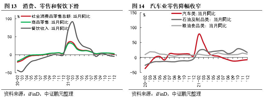 日用品加快,汽車供給持續(xù)改善。12月份,限額以上單位糧油食品類商品零售額同比增長11.3%,增速比上月下降3.5個(gè)百分點(diǎn),但仍維持高位;日用品類商品零售額增長18.8%,加快10.2個(gè)百分點(diǎn);服裝類商品零售額下降2.3%,降幅比上月收窄1.8個(gè)百分點(diǎn)。限額以上單位文化辦公用品類、化妝品類商品零售額分別同比增長7.4%和2.5%,增速分別比上月下滑10.7和5.7個(gè)百分點(diǎn)。由于芯片供應(yīng)有所改善,汽車類商品供給增加,銷售降幅收窄。限額以上單位汽車類商品零售額同比下降7.4%,降幅比上月收窄1.6個(gè)百分點(diǎn)。