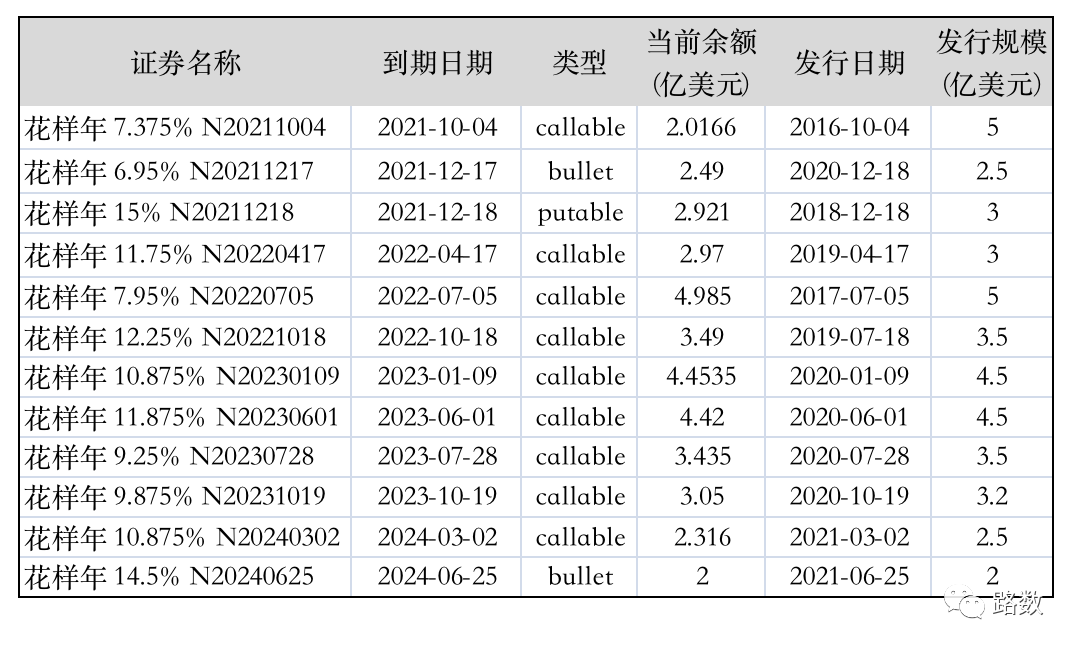這些存量美元債當時成本較高。比如,2021年12月18日到期的那筆,票面利率是15%。
