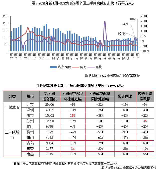 2022年第4周,南京二手住房成交面積收15.6萬平方米,環比較上周回升11%,同比跌幅收窄至38%。本周成交規模“三連漲”且同比跌幅持續收窄,預計后續市場或保持穩中有增。