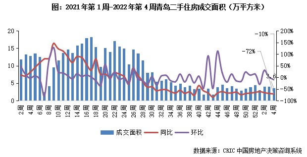2022年第4周,青島二手住房成交面積環比下降10%、同比下降72%,成交規模3.6萬平方米。市場長期嚴控下消費者普遍購房信心不足,當前成交規模持續低位運行。