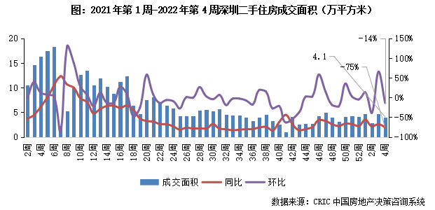 2022年第4周,深圳二手房成交4.1萬平方米,環比下降14%,同比降幅擴至75%。深圳二手房市場長期低位震蕩,受政策高壓當前市場觀望情緒仍然濃重,后市大概率延續走勢。