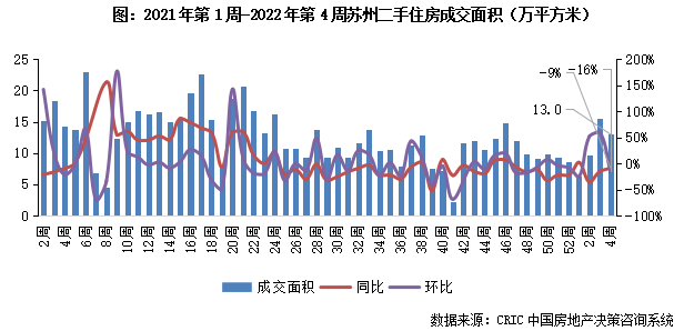 2022年第4周,蘇州二手住房成交面積環比降16%至13.0萬平方米,同比跌幅收窄至9%。本周市場成交量雖較上周回落但仍處高位,后續市場短期或高位企穩。