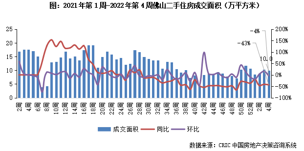 2022年第4周,佛山二手住房成交面積環比微跌4%、同比降幅43%,成交體量收10.0萬平方米。本周市場成交正常小幅回調,短期內市場或在當前規模震蕩。