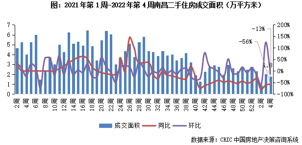 2022年第4周,南昌二手住房成交規模收1.8萬平方米,環比降13%,同比跌幅收窄至56%。“房地產稅”相關政策出臺致樓市再降溫,成交規模震蕩下行走勢浮現。