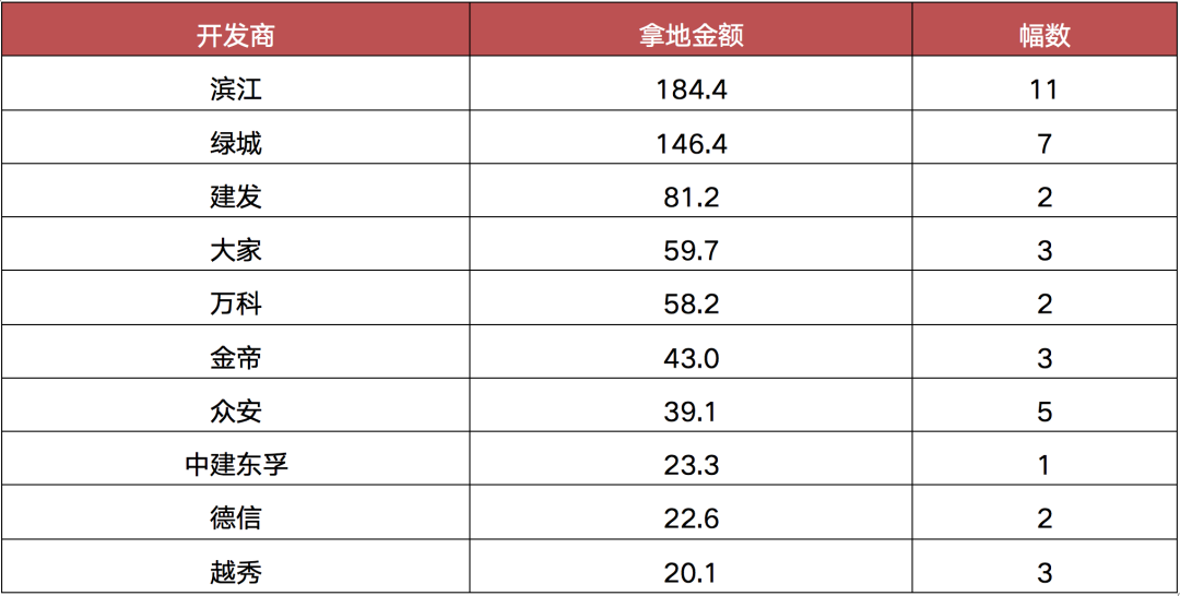 從房企拿地來看,本土民企表現(xiàn)活躍,尤其是濱江成為最大贏家,本輪拿下11幅地塊,拿地金額超過180億元,而綠城則緊隨其后。外來房企仍然以資金實力充沛的央企和國企為主,比如如大悅城、保利、招商、越秀、華潤、中鐵建、建發(fā)等均積極參拍