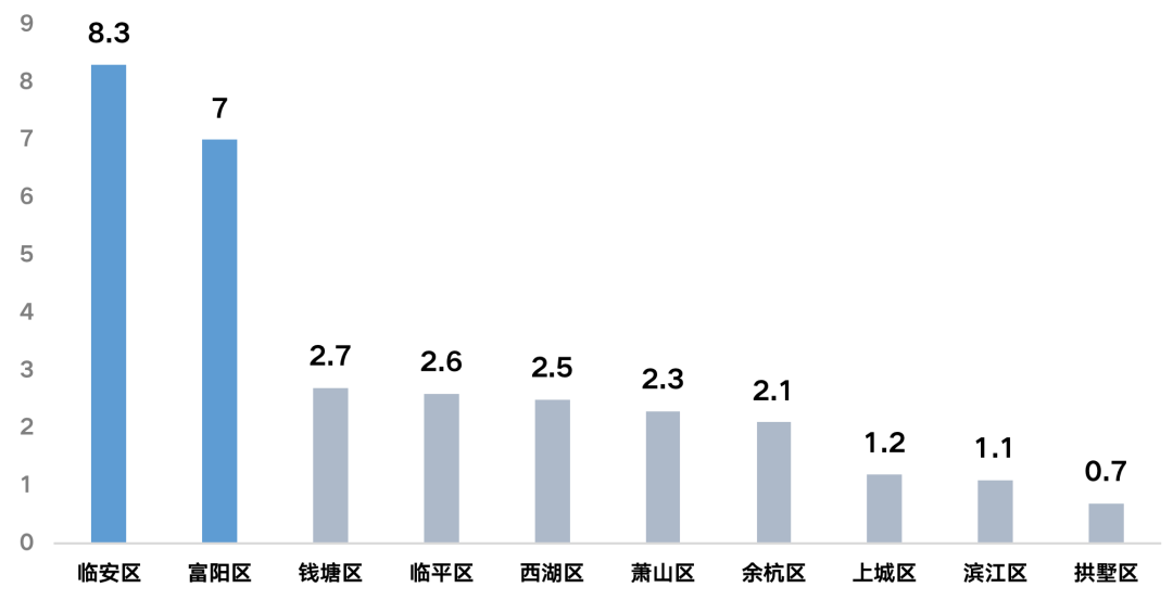 從去化來看,雖全市商品住宅去化僅為4.2個月,但臨安、富陽區(qū)的商品住宅去化周期顯著高于其他區(qū)域,分別為8.3個月和7個月。