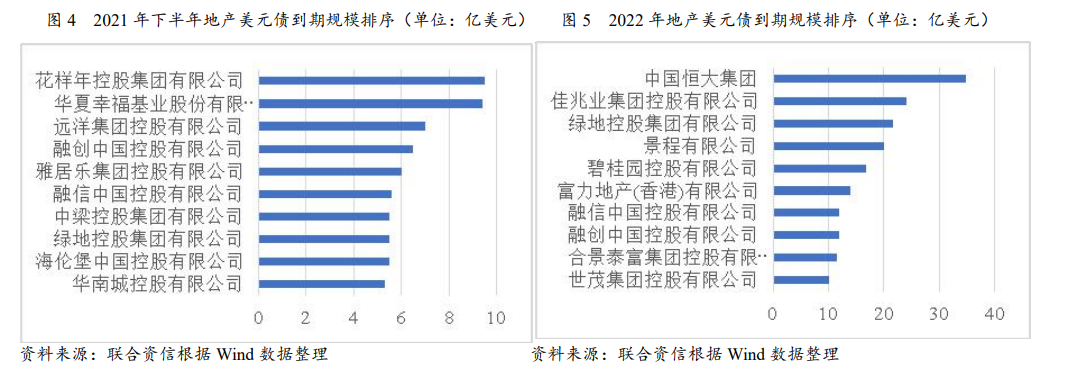 從到期規(guī)模來看,2021年下半年及2022年地產(chǎn)美元債到期規(guī)模較大的房企如下圖所示。