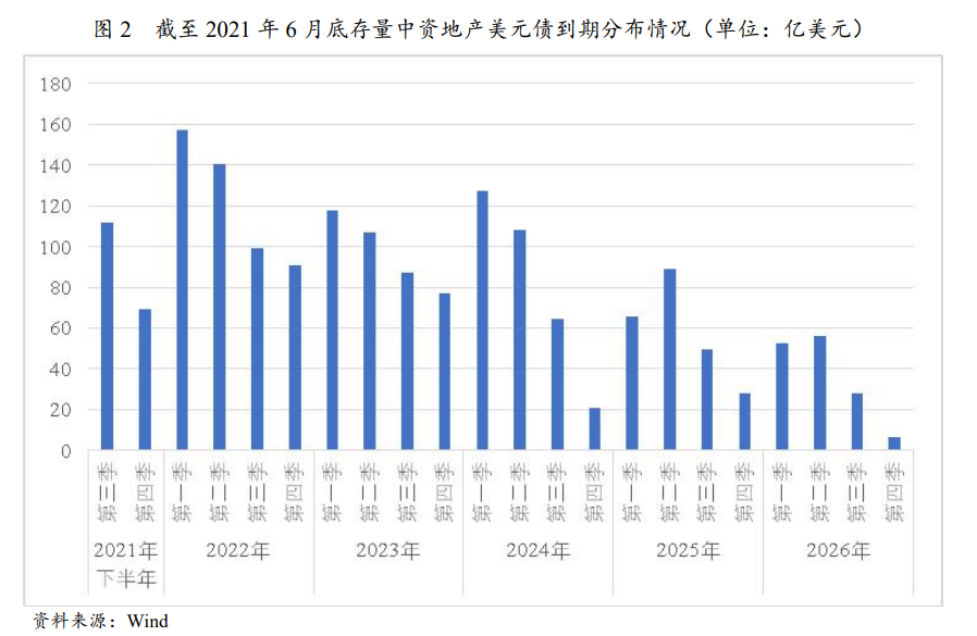 從未來的到期情況看,未來1年房企大量美元債密集到期。截至2021年6月底,未來12個(gè)月內(nèi)逾478億美元債務(wù)面臨到期,其中2022年1季度到期規(guī)模最大,再融資需求大。若市場持續(xù)大幅波動(dòng),將進(jìn)一步加劇房地產(chǎn)企業(yè)再融資壓力。